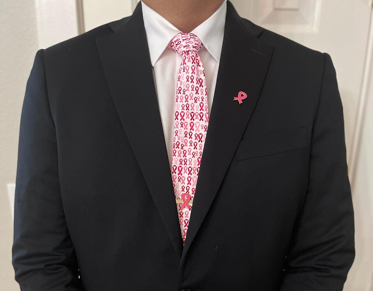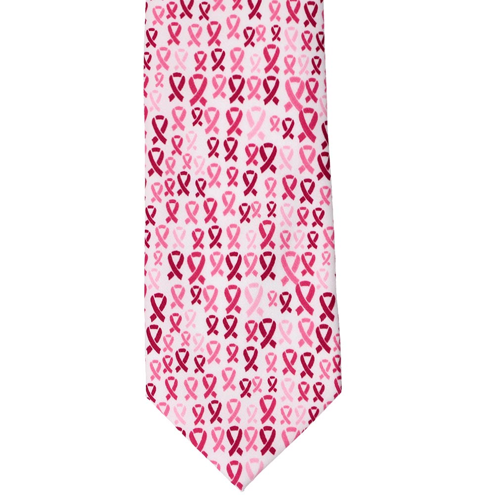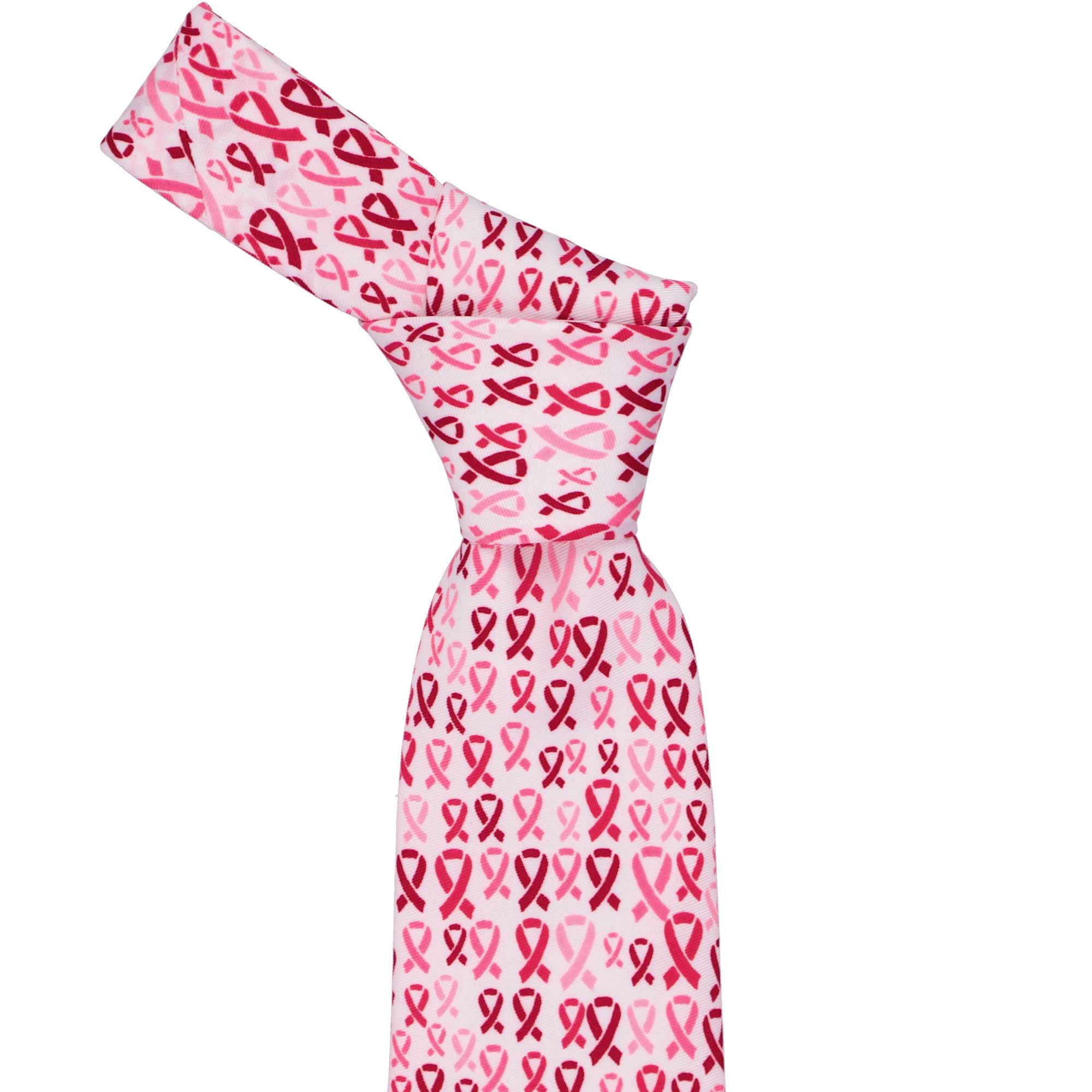 Show your support in the fight against Breast Cancer with this pink ribbon tie. This tie is a top pick for October events and year-round awareness. The pattern features four shades of pink ribbons on a pale pink background. Wear it with a navy blue, black or gray suit or a classic white dress shirt and slacks.